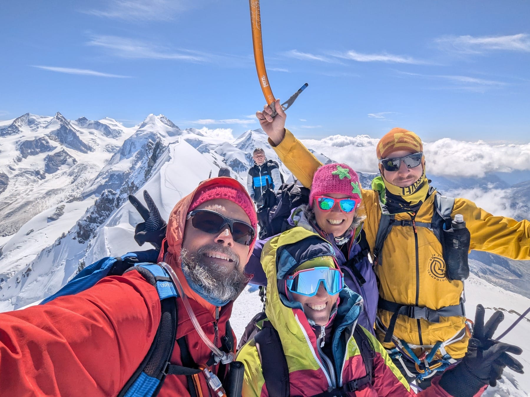 Me, Elisabetta, Simonetta, and Manuel (guide) at the Western Breithorn summit (4164m) in Italy on July 31, 2025, at 12:20. Photo by Aki Kärkkäinen.